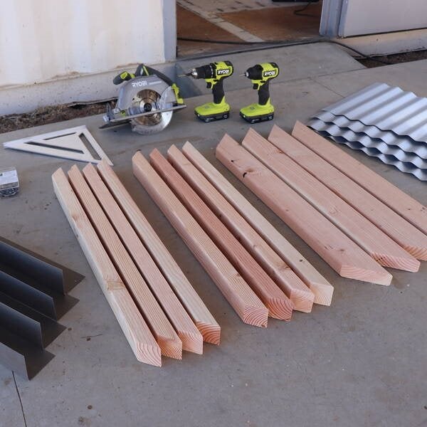 Резрежьте листы профнастила на куски нужногоразмера, а затем закрепите их по бокам стандартными кровельными саморезами.