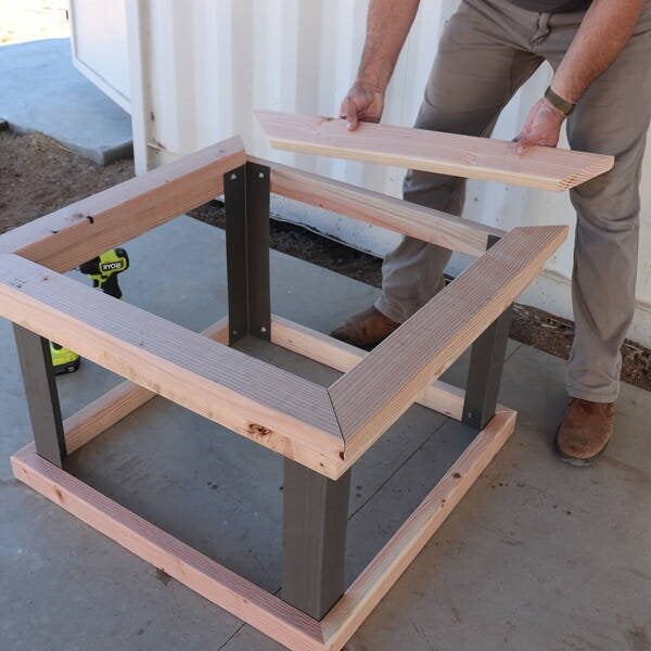 Начните с изготовления двух наборов одинаковых рамок из деревянного бруса сечением 50 x 75 мм и обрежьте концы торцовочной пилой под углом 45 градусов так, чтобы они хорошо подходили друг к другу.